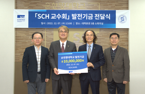 [충청뉴스 박동혁 기자] 순천향대학교는 30여 명의 동문 교수들로 구성된 SCH 교수회가 지난 7일 후배들을 위한 장학금 1천만 원을 기탁했다고 밝혔다.