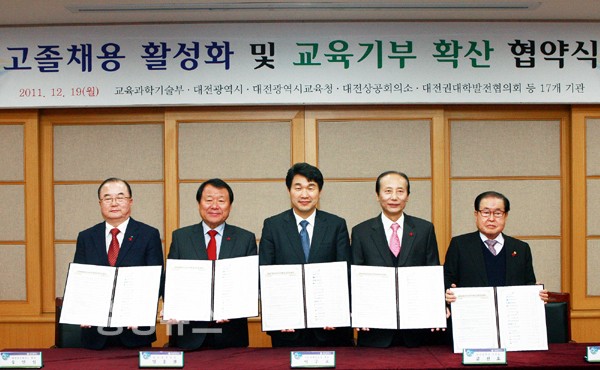 대전시와 교육과학기술부, 시교육청, 대전상공회의소, 대전권대학발전협의회, 기업 및 경제단체 등 17개 기관이 19일 시청 대회의실에서 ‘고졸채용활성화 및 교육기부 확산을 위한 업무협약’을 체결했다.