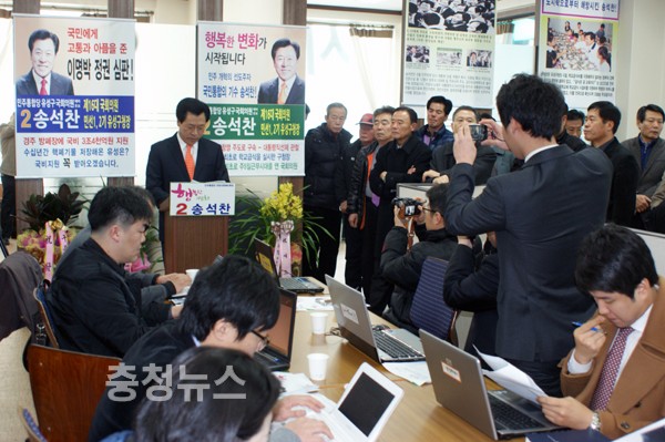 민주통합당 송석찬 유성구 예비후보가 20일 장대동에 위치한 선거사무실에서 출마 기자회견을 갖고, 이상민 국회의원이 입당할 경우 선진당으로부터 공격당해 하루 아침에 침몰당할 것이라고 경고했다.