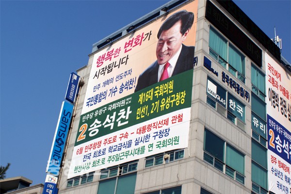▲ 송석찬 예비후보 선거사무실 외벽에 걸린 메인 캐치프레이즈 '행복한 변화가 시작됩니다'