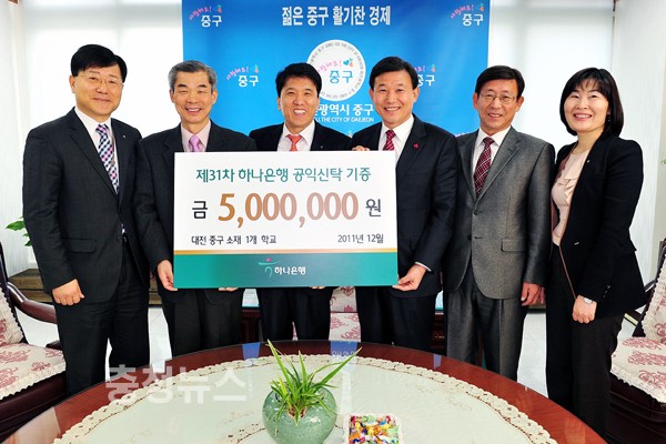 하나은행 대전영업본부는 20일 대전 중구청장실에서 국민들로부터 수탁 또는 모집한 자금을 운용해 마련된 공익신탁기금 500만원을 교육과학기술부 추천으로 선정된 대전국제통상고등학교에 전달했다.