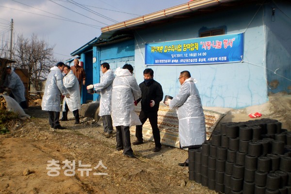 대전 대덕구(구청장 정용기) 건축팀 직원과 2011년 희망의 집수리사업 참여업체 임원 60여명은 19일 대덕구 평촌동 청자마을을 방문해 어려운 이웃 5세대에 사랑나눔 연탄 2000여장을 배달하고 저소득 가정 7가구에 140만원 상당의 희망상품권을 전달했다.