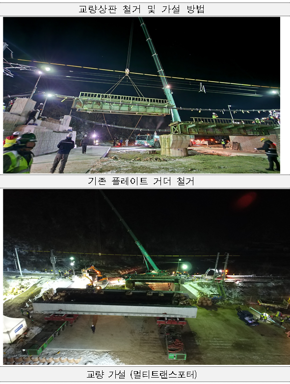 강원본부는 노후화가 심한 석현2교 하부 구조물을 우선 보강하고, 열차 운행이 중지된 야간 시간에 특수 운반장비인 멀티트랜스포터를 사용해 신설 교량으로 교체 완료함으로써 열차 소음과 진동을 저감하고 교량 안전성과 열차안전운행 여건을 동시에 확보하였다.