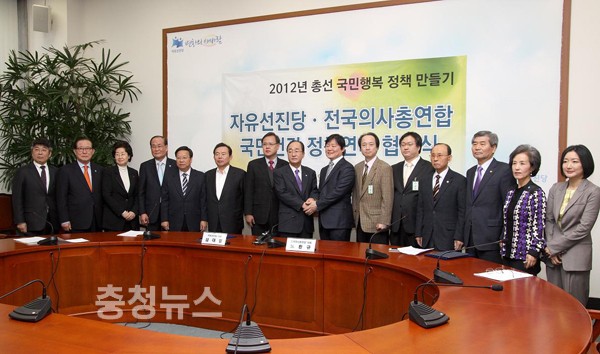 자유선진당(대표 심대평)과 전국의사총연합(대표 노환규)은 21일 국회 본청 215호에서 선진화된 의료제도를 수립하기 위해‘국민건강 정책연대 협약식’을 가졌다.