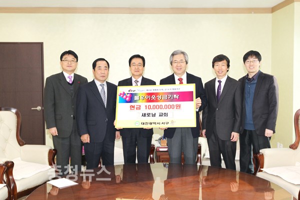 대전 서구(구청장 박환용)는 21일 만년동 새로남교회 오정호 담임목사로부터 어려운 이웃돕기 성금 1,000만원과 케익 146개를 기탁 받았다.