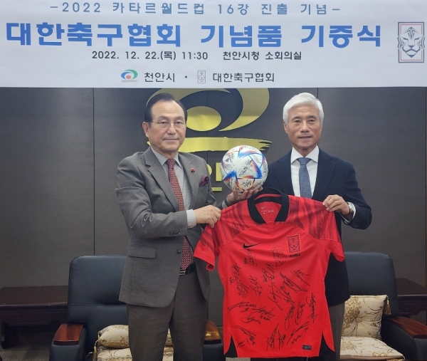천안시는 22일 대한축구협회(KFA)로부터 축구공과 선수들의 친필 사인 유니폼, 특히 월드컵에서 손흥민 선수에게 제공됐던 등번호 7번 유니폼을 기증받았다.