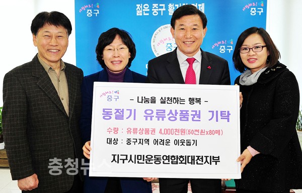 지구시민운동연합회 대전지부(대표 임희숙)는 22일 어려운 이웃들이 따뜻한 겨울을 보낼 수 있도록 해 달라며 박용갑 중구청장을 찾아 400만원 상당의 유류상품권을 기탁했다.