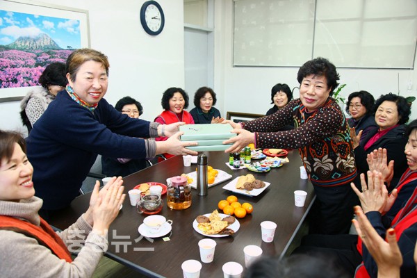 한남대학교(총장 김형태) 여교수회 교수들은 23일 사범대 학장실에 모여 대학 소속 환경미화원들에게 따뜻한 성탄절을 보내기를 바라는 마음을 담아 방한용 양말이 담긴 선물상자 40개를 전달했다.