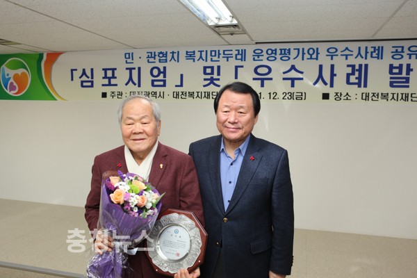 이인구 계룡건설 명예회장은 지난 23일 대전복지재단 9층에서 열린 ‘민∙관협치 복지만두레 운영평가와 우수사례 공유를 위한 심포지엄 및 우수사례 발표’에서 복지만두레 발전에 기여한 공로로 염홍철 대전시장으로부터 감사패를 받았다.