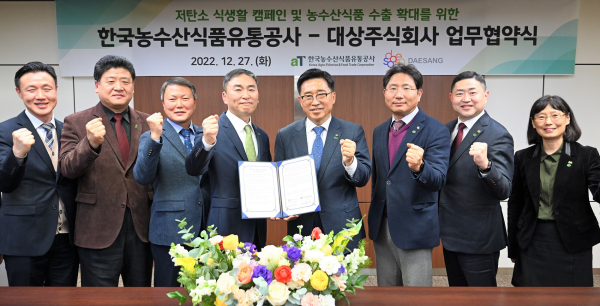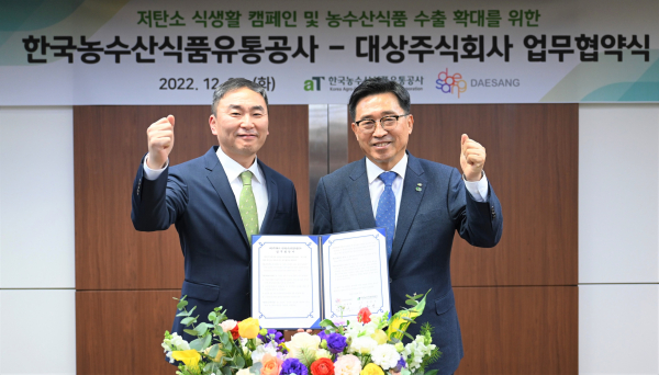 [충청뉴스 최형순 기자] 한국농수산식품유통공사(사장 김춘진)는 27일 서울 aT센터에서 대상주식회사(대표이사 임정배)와 저탄소 식생활 확산과 K-푸드 수출 확대를 위한 업무협약을 체결했다.