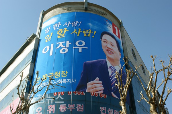 ▲ 이장우 예비후보 사무실 외벽의 현수막