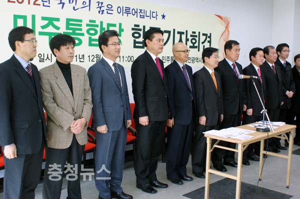 민주당, 시민통합당, 한국노총이 함께하는 민주통합당 대전시당(공동위원장 박범계, 우영제)이 27일 시당사에서 합동 기자회견을 갖고, 2012년 총선 승리와 대선 정권 교체를 다짐했다.