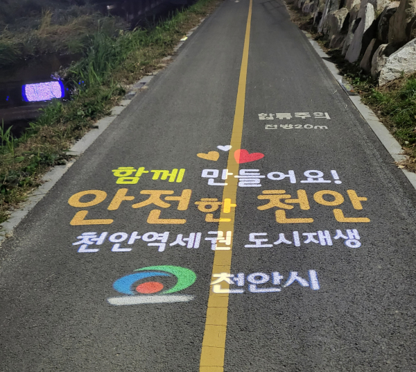 ‘함께 만들어요! 안전한 천안’, ‘안심하고 걸어요’, ‘안전한 우리동네’ 등 범죄예방 문구와 함께 귀여운 천안프렌즈 캐릭터가 다소 어두웠던 인도와 산책로를 환히 밝히고 있다.