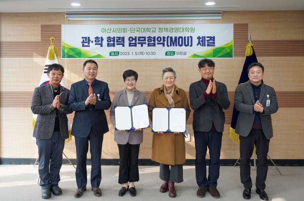 [충청뉴스 박동혁 기자] 충남 아산시의회는 5일 의장실에서 단국대학교 정책경영대학원과 상호 공동 협력 체계 구축을 위한 업무협약을 체결했다고 밝혔다.