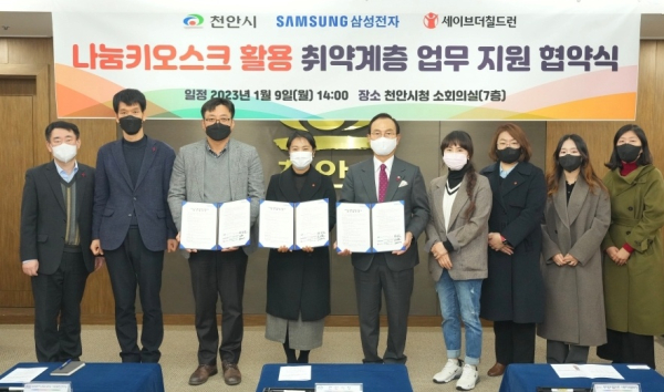 [충청뉴스 박동혁 기자] 충남 천안시는 9일 시청에서 삼성전자 천안·온양캠퍼스, 세이브더칠드런 서부지역본부와 ‘나눔키오스크 활용 취약계층 지원을 위한 업무협약’을 체결했다.