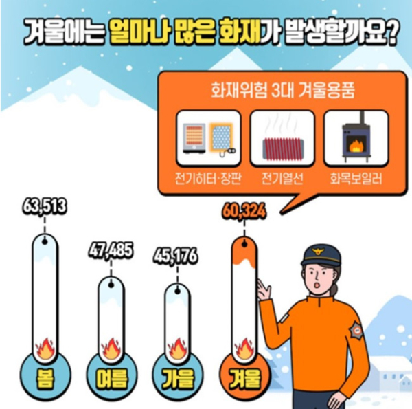소방서 관계자는 “난방용품으로 겨울을 따뜻하게 보낼 수 있지만 반대로 화재 발생 위험이 높아진다”며 “조금만 관심을 기울여 안전 수칙을 준수한다면 안전하고 따뜻한 겨울을 보낼 수 있다”고 말했다.