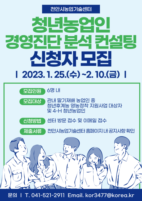 [충청뉴스 박동혁 기자] 천안시농업기술센터는 내달 10일까지 청년농업인 경영진단·분석 컨설팅 대상자를 모집한다고 25일 밝혔다.