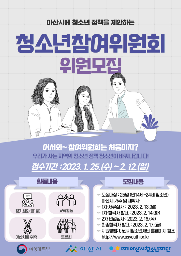 [충청뉴스 박동혁 기자] 아산시청소년재단은 청소년참여위원회 위원을 모집한다고 25일 밝혔다.