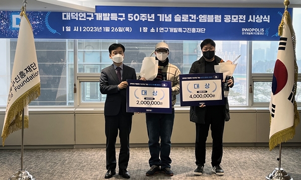 영예의 대상에는 슬로건 부문 '대덕이 담은 50년, 미래를 잇는 50년'을 제출한 류재필씨와 엠블럼 부문 '혁신 클러스터를 통한 대한민국 미래경제의 리더'를 주제로 표현한 고정곤씨에게 돌아갔다.