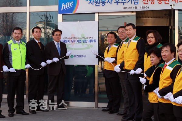 하이트진로(주) 대전지점은 11일 대전시로부터 자원봉사문화를 선도한 공로를 인정받아 ‘자원봉사 우수기업’으로 선정돼 동판 제막식을 가졌다.