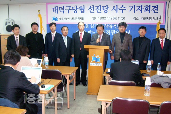 자유선진당 권선택 대전시당위원장을 비롯한 대덕구당원협의회 주요당직자들이 12일 시당사에서 국회의원 및 민주통합당에 대한 규탄 기자회견을 갖고, “철새정치인은 정치를 떠나라”고 한목소리로 외쳤다.