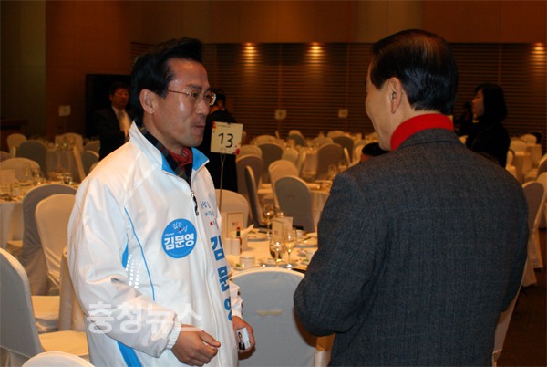 ▲ 한나라당 김문영 예비후보가 지인을 만나 대화를 나누고 있다.