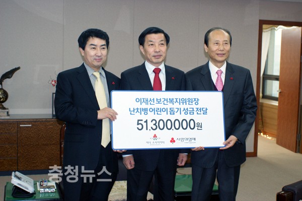이재선 국회 보건복지위원장(선진당, 서구을)이 지난 18일 난치병어린이를 돕기 위해 사회복지공동모금회에 기부한 출판기념회 수익금 5천1백3십만원을 19일 김신호 대전시교육감을 만나 대전교육청에 지정 기탁했다.