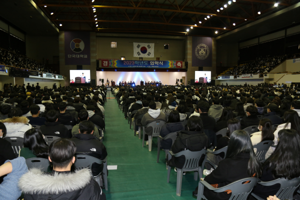 단국대는 이날 양 캠퍼스 체육관에서 18개 학부 55개 학과 5,108명(죽전 2,578명, 천안 2,530명) 신입생에 대한 2023학년도 입학식을 거행했다.