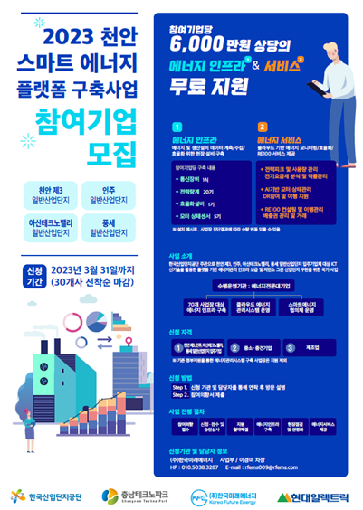 [충청뉴스 박동혁 기자] 충남테크노파크(이하 충남TP)는 한국산업단지공단에서 시행하는 2023년도 스마트에너지플랫폼 FEMS(Factory Energy Management System) 구축 공모사업에 참여할 기업(수용가)을 내달 20일까지 모집한다고 밝혔다.