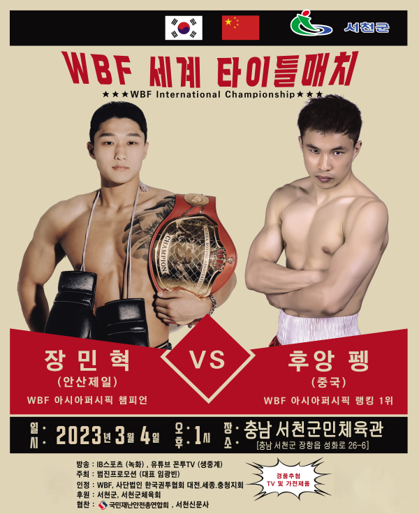 [충청뉴스 서천 = 조홍기 기자] 오는 3월 4일 오후 1시, 서천군민체육관 특설링에서 장민혁(한국, WBF 아시아퍼시픽 챔피언) vs 후안펭(중국, WBF 아시아퍼시픽 랭킹 1위)의 WBF 아시아퍼시픽 챔피언 세계타이틀 매치가 열린다.