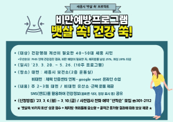[충청뉴스 최형순 기자] 세종시보건소가 40∼50대 중년을 대상으로 비만 예방·관리를 위한 ‘뱃살 쏙! 건강 쑥!’ 프로그램을 운영한다.