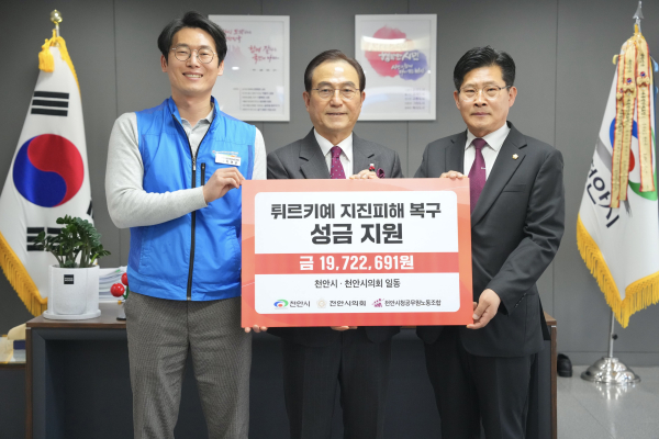 지난달 27일까지 모금한 결과 천안시·천안시의회는 1,972만 2,691원을 모아 3일 전달식을 열고 뷰첵메제시를 통해 튀르키예 정부에 전달하기로 했다.