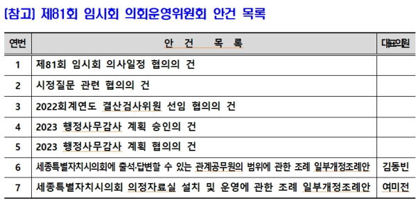 이날 발표에 따르면 제81회 임시회 기간 중 의회운영위원회에서는 ‘2023년도 행정사무감사 계획 승인의 건’ 등 협의안 4건과 승인안 1건, 조례안 2건 등을 처리할 계획이다.