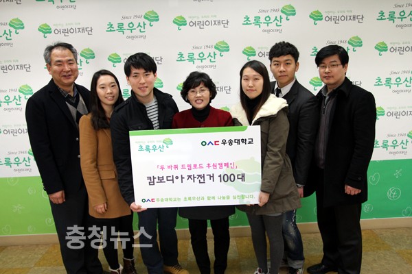 우송대학교(총장 존 엔디콧)는 1일 초록우산 어린이재단 대전지역본부를 방문해 사회복지아동학부의 김학만·류한수 교수 및 우송대학교 학생대표 4명이 참석한 가운데 ‘두바퀴 드림로드’ 캠페인과 관련 캄보디아 지역아동을 위한 자전거 100대를 후원했다.