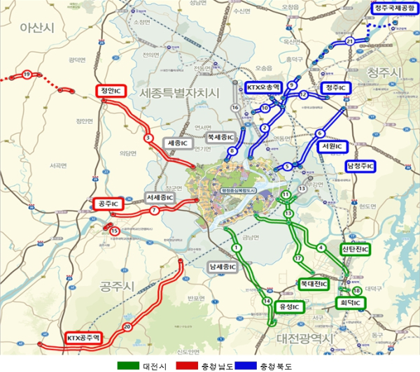 또‘행복도시~남청주IC 연결도로’와‘행복도시~청주 연결도로’는 행복도시와 청주 도심을 오가는 새로운 교통축으로서 여객 수요 분담에 일익을 담당하고 있다.