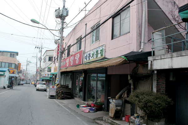 혹여 눈이라도 마주칠까 서둘러 발걸음을 옮기니 옛날 목욕탕이 보인다. 영업한 지 오래됐는지 청온탕이라는 글자를 붙인 유리창 한쪽이 깨졌다. 그 외에도 몇몇 가게가 눈에 띈다. 연탄을 후원하는 연탄은행과 춘하추동 영양탕 집이다.