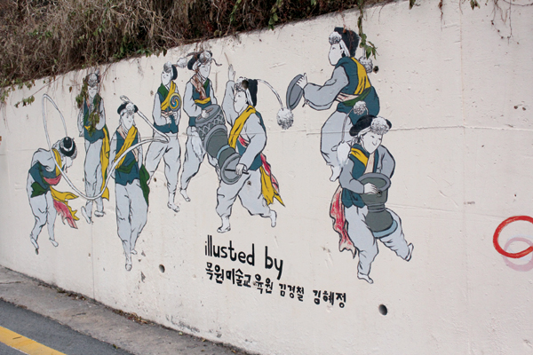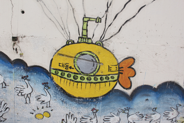 소로였다는 할머니의 말처럼 길이 꼬불꼬불 이어진다. 골목길에서 나오니 멀찍이 벽화가 보인다. 2007년 문화관광부 산하 공공미술추진위에서 실시한 ‘소외지역 개선을 위한 공모사업’에 선정된 대동은 지역미술인 30여 명이 참여해 벽화를 그리고 조형물을 설치하는 미술프로그램이 진행됐다. 그려진 지 좀 오래돼서일까? 벽에 그려진 울타리 색이 바랬다. 벽화를 보며 골목으로 들어서자 아까와는 달리 깔끔하게 정돈된 골목길이 나온다. 파스텔색조 벽화 때문인지 산뜻하다.
