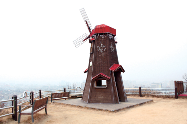 하늘공원은 2009년 12월, ‘대동마을쉼터사업’의 하나로 동네 언덕마루에 조성했다. 주민이 휴식을 취하며 도심의 풍광을 즐길 수 있게 공원에는 벤치와 정자가 있다. 그리고 풍차가 있다. ‘누구누구 왔다감’, 이름과 이름 사이에 하트도 그려 넣었다. 그렇게 낙서로 뒤덮인 커다란 풍차가 오도카니 서 있다.