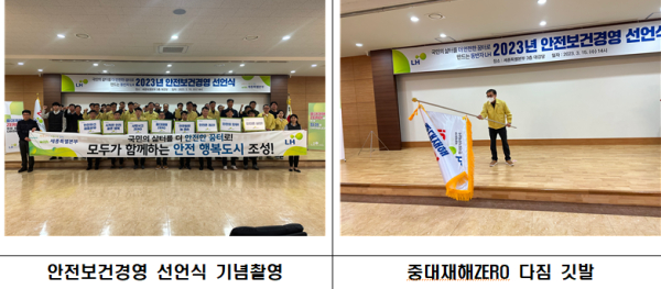 [충청뉴스 최형순 기자] LH 세종특별본부(본부장 이대영)는 15일, 본부 대강당에서 건설관련 부서장 및 현장 감독소장 등 약 40명이 참석한 가운데 “2023년 LH 세종특별본부 안전보건경영 선언식”을 개최하였다.