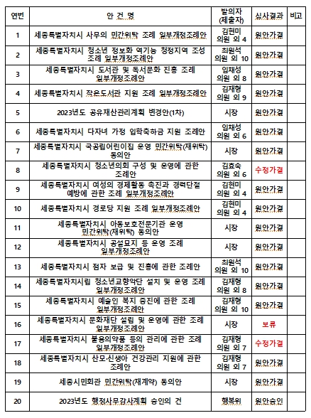 이날 심사한 조례안은 15건 중 12건이 원안 가결되었고, 2건이 수정이 가결되었으며 1건은 보류됐다.