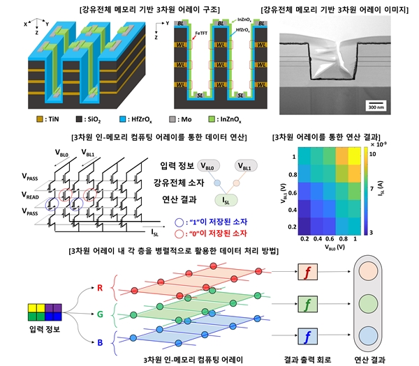 산화 하프늄 기반 강유전체 물질과 산화물 반도체 채널 층을 활용해 고성능 강유전체 메모리 소자를 개발하고, 이를 어레이 구조로 집적한 인-메모리 컴퓨팅 어레이를 구현했다.