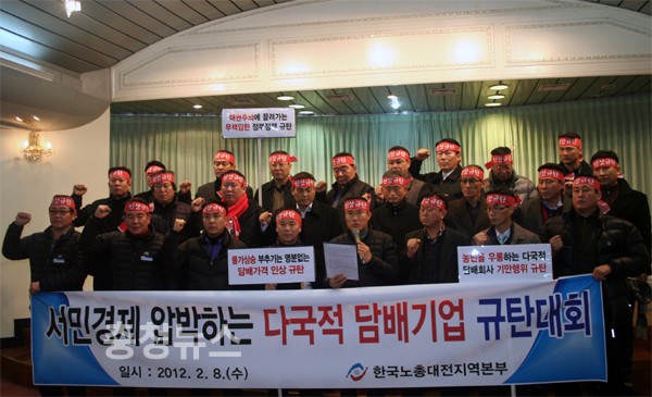 이와 관련해 이종호 한국노총 대전지역본부 의장은 “다국적 담배회사들이 강력한 패권주의 힘을 앞세워 10년 전 대한민국에 담배제조공장을 설립하고, 잎담배생산 농민의 불만을 잠재우기 위해 국내산 잎담배 사용을 약속했지만 지금까지 전혀 이행할 생각조차 하고 있지 않다”고 질타했다.
