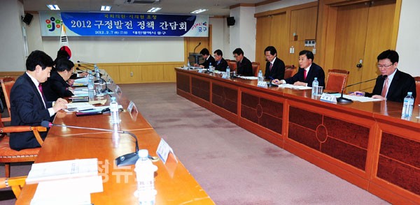 대전 중구(구청장 박용갑)는 지난 7일 지역 국회의원과 시의원을 초청해 중회의실에서 국·시비 확보 및 구정발전을 위한 정책 간담회를 가졌다.