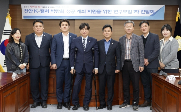 [충청뉴스 박동혁 기자] 충남 천안시의회는 ‘천안 K-컬처 박람회 성공개최 지원을 위한 연구모임 (이상구 대표의원, 강성기·김강진·노종관·류제국·이종만·육종영 의원)’이 지난 24일 복지문화위원회 회의실에서 1차 간담회를 가졌다고 밝혔다.