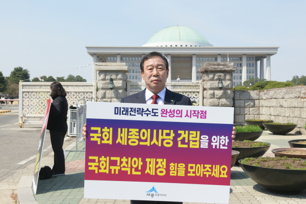 [충청뉴스 최형순 기자] 최민호 세종시장이 27일 서울 여의도 국회 본원 앞에서 국회 세종의사당 건립을 위한 국회규칙안의 조속한 제정을 촉구하는 1인 시위를 강행했다.