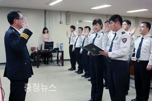 ▲ 허영범 충남경찰청 차장이 학교폭력 전담경찰관들과 함께 선서를 하고 있다.