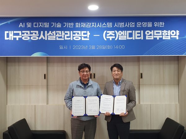 [충청뉴스 박동혁 기자] ㈜엘디티는 대구 공공시설관리공단(이하 공단)과 AI 및 디지털 기술 기반 화재감지시스템 시범사업 운영을 위한 업무협약을 체결했다고 3일 밝혔다.