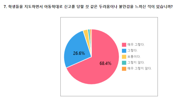 학생을 지도하면서 아동학대로 신고 당할 것 같은 불안감을 느낀다는 교원이 전체 응답의 94%를 차지했고, 아동 학대 신고가 두려워 생활 지도를 주저하거나 하지 못했다는 응답이 94.7%로 나왔다.