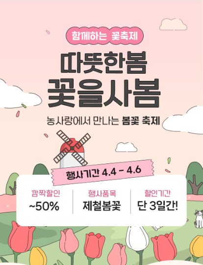 또한, 화훼농가가 직접 엄선한 봄꽃세트상품을 2주마다 배송하는 생화 정기구독 서비스를 런칭해 선착순 100명에게 얼리버드 혜택 50% 할인을 제공한다,