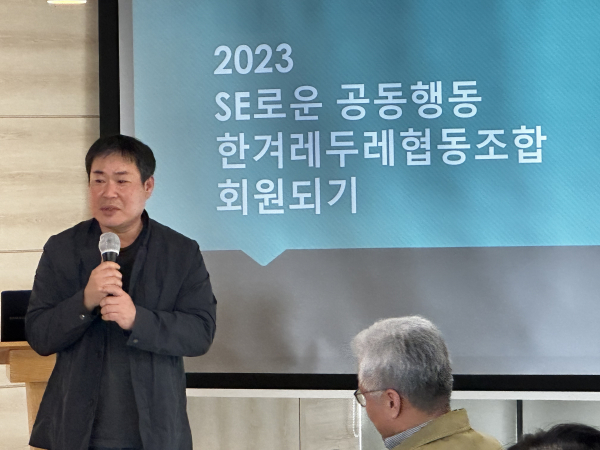 퍼포먼스 전 사회인 하재찬 연대회의 상임이사는 SE로운이란 사회적경제 다움이란 것을 강조하며 이후 각 지역과의 간담회 계획을 발표했고, 김경환 한겨레두레 상임이사는 이번 캠페인에 참여하는 주체와 이익을 나누기 위한 한겨레두레 선불약정회원에 대한 설명과 함께 사회적경제와 시민 참여를 당부했다.